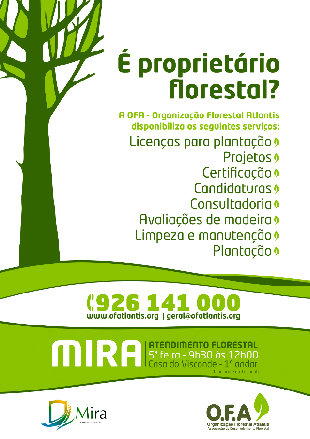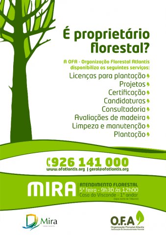 A partir de agora os proprietários e produtores florestais do concelho de Mira, podem aceder mais facilmente ao apoio técnico da OFA – Organização Florestal Atlantis, Associação de Desenvolvimento Florestal, que através de uma parceria com o Município de Mira abrirá um Gabinete Florestal no concelho. Neste Gabinete, os proprietários florestais passam a ter acesso a apoio técnico e informação relevante para a gestão dos seus terrenos, nomeadamente ao nível de licenciamento para (re)arborização, da certificação da gestão florestal, das candidaturas a apoios financeiros, das plantações florestais e da manutenção dos povoamentos.