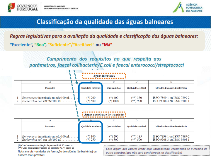 “As condições necessárias para garantir em segurança a utilização das águas identificadas como balneares passam não só pelos acessos, infraestruturas e segurança das praias, mas também pela qualidade da água. Esta qualidade representa um fator de saúde pública e um importante indicador de qualidade ambiental e de desenvolvimento turístico.” (snirh.apambiente.pt)