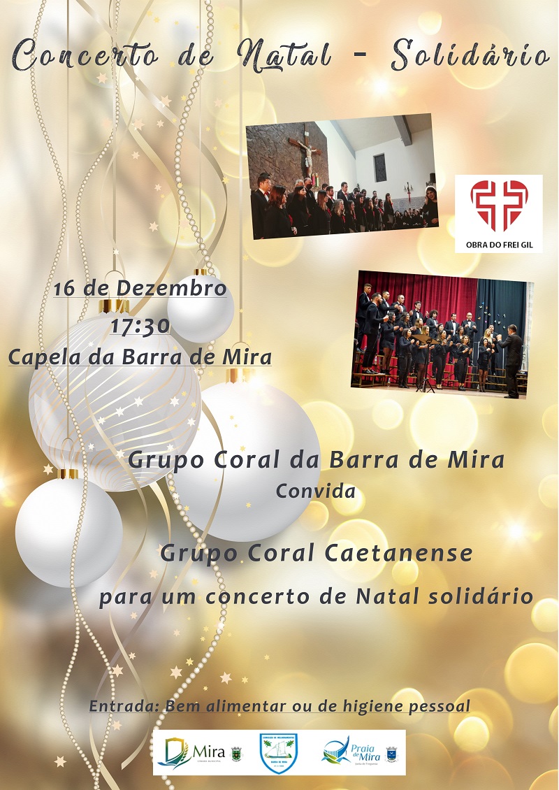 O Grupo Coral da Barra de Mira organiza, pela terceira vez, o Concerto de Natal Solidário, que ocorrerá no dia 16 de Dezembro, pelas 17h30, na Capela de Nosso Senhor dos Aflitos, Barra de Mira.