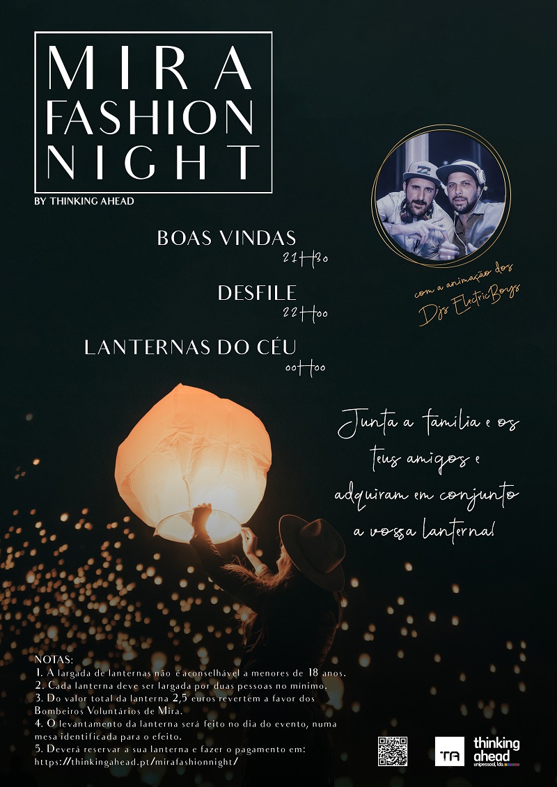 A partir da meia noite, decorrerá a largada de lanternas ao céu. De cariz solidário (por cada lanterna 2,50 euros reverterão a favor dos Bombeiros Voluntários de Mira), este momento que simboliza saúde, bem-estar, sucesso e felicidade, é uma oportunidade única para o público se juntar em família e/ou amigos lançarem a sua lanterna. Para adquirirem a lanterna todos os interessados devem inscrever-se em: https://thinkingahead.pt/mirafashionnight/ e o levantamento da lanterna será feito no dia, junto do secretariado.