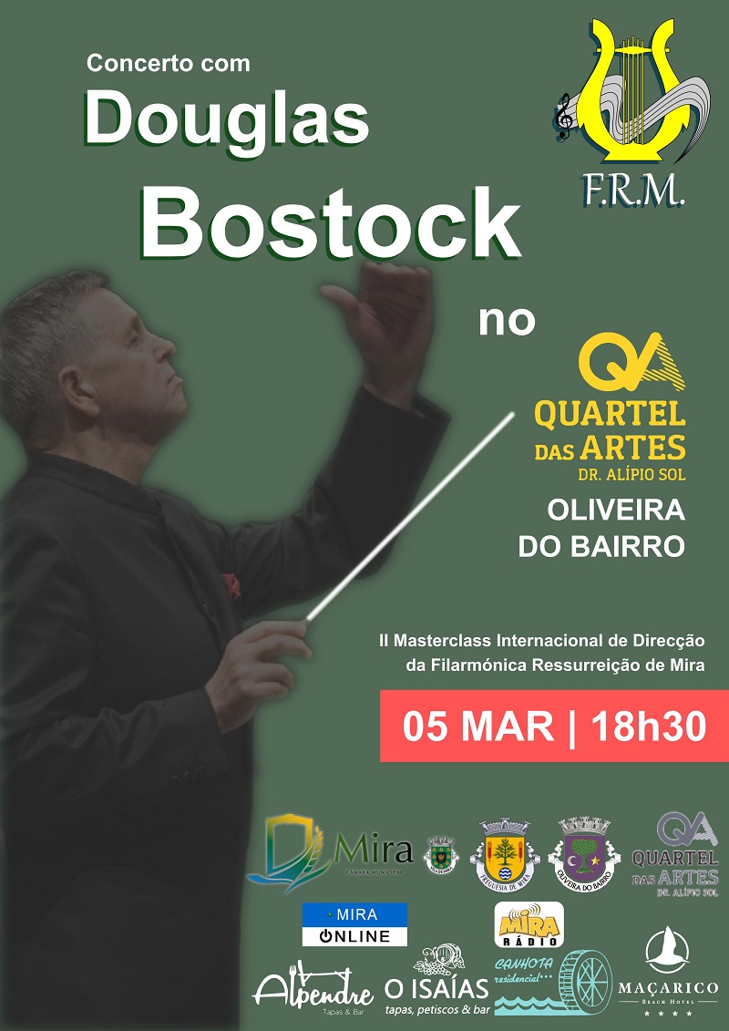 A Filarmónica Ressurreição de Mira convidar V. Ex.ª para a assistir ao concerto de encerramento do II Masterclass Internacional de Direção e Estágio de Orquestra de Sopros dirigido pelo Maestro DOUGLAS BOSTOCK.