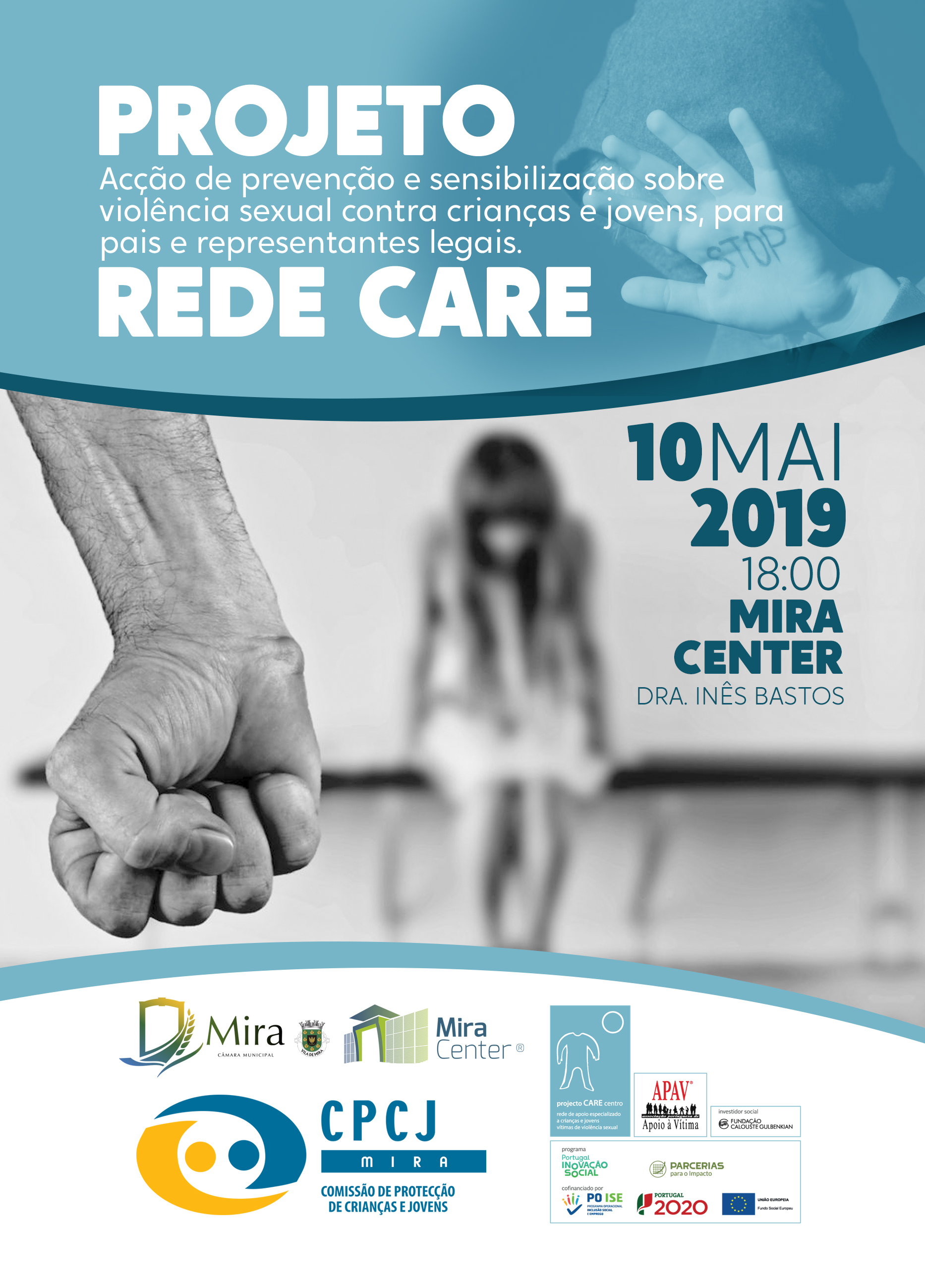 A CPCJ em parceria com a APAV - projeto Rede Care - rede de apoio especializado da APAV a crianças e jovens vitimas de violência sexual, vai levar a efeito no dia 10 de maio (sexta feira), pelas 18h, no edifício Mira Center, uma ação de prevenção e sensibilização sobre a temática atrás mencionada, dirigida a pais, representantes legais e outros interessados. A sessão será orientada pela técnica da APAV Dr.ª Inês Bastos.