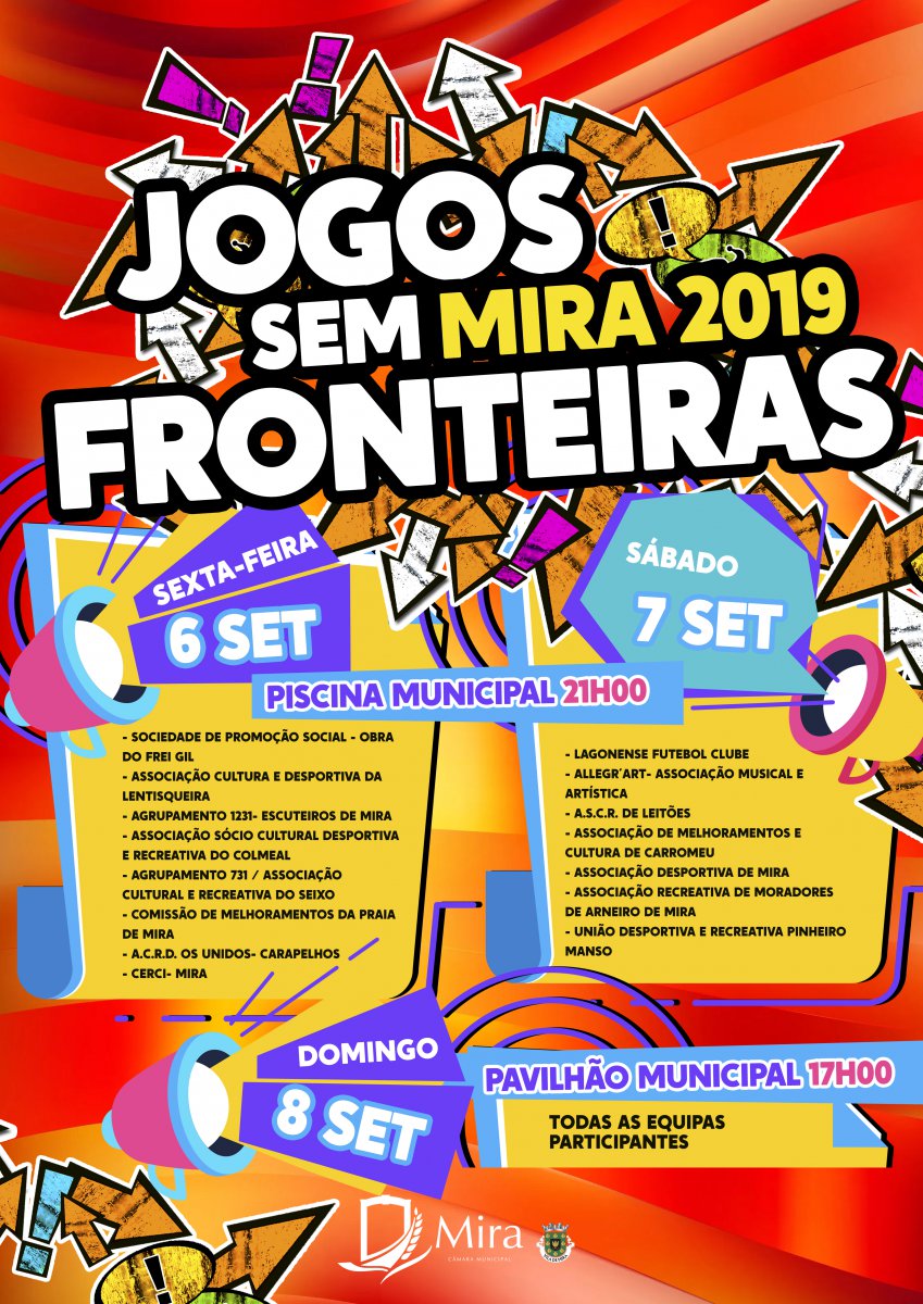 De 6 a 8 de setembro, irão decorrer os Jogos Sem Fronteiras de Mira 2019, na Piscina e Pavilhão Municipal. Este evento de cariz desportivo visa fomentar o convívio entre as Associações e localidades do concelho no decorrer dos 3 dias. Com equipas de todas as freguesias do concelho, perfazendo um total de 15 equipas inscritas, aguarda-se um fim-de-semana de grande convívio, tal foi o interesse demonstrado por parte das Associações participantes.