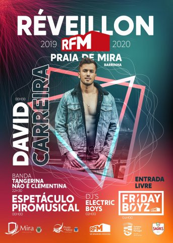 O cantor David Carreira é o cabeça de cartaz do "Réveillon" da Praia de Mira numa noite que conta com a Banda Tangerina não é Clementina, um Espetáculo Piromusical e os Djs Electric Boys e Friday Boys.