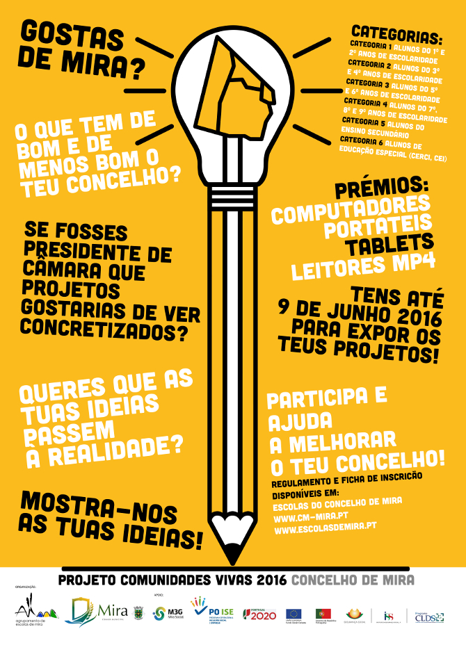 Faz parte da cidadania ativa a participação e o envolvimento cívico da população sobre o processo de desenvolvimento municipal. É neste sentido que a Câmara Municipal de Mira em parceria com o Agrupamento de Escolas de Mira, convidam e desafiam a Comunidade Escolar do concelho a olhar, observar, analisar e refletir sobre o concelho de Mira, desenvolvendo trabalhos sobre o tema “O Meu Concelho”, considerando 3 perspetivas de abordagem: o que tem de bom o meu Concelho; o que tem de menos bom o meu Concelho, e se eu fosse Presidente de Câmara que projetos gostaria de ver concretizados no futuro.