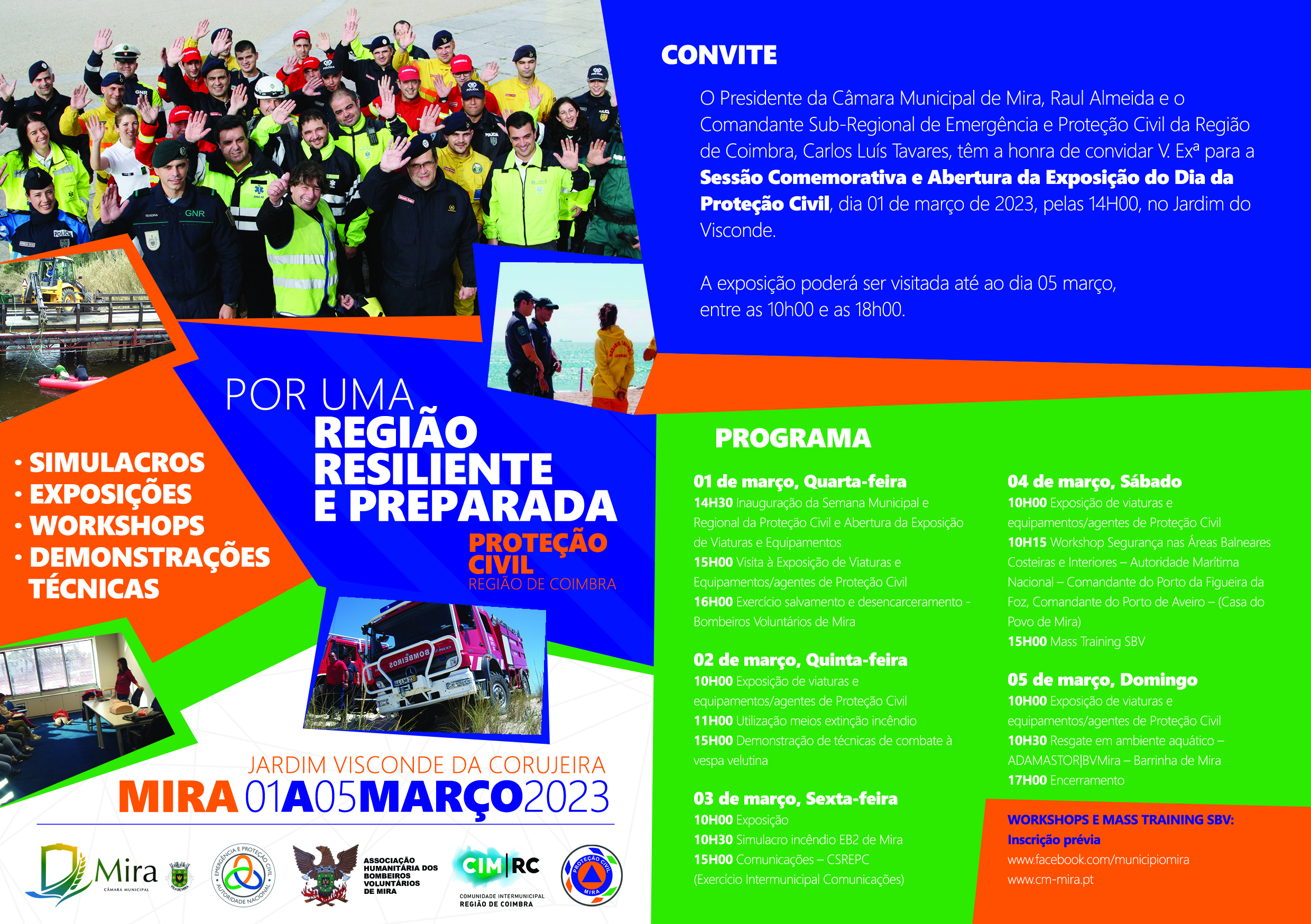 O Presidente da Câmara Municipal de Mira, Raul Almeida e o Comandante Sub-Regional de Emergência e Proteção Civil da Região de Coimbra, Carlos Luís Tavares, têm a honra de convidar V. Exa para a Sessão Comemorativa e Abertura da Exposição do Dia da Proteção Civil, dia 1 de março de 2023, pelas 14H00, no Jardim do Visconde.