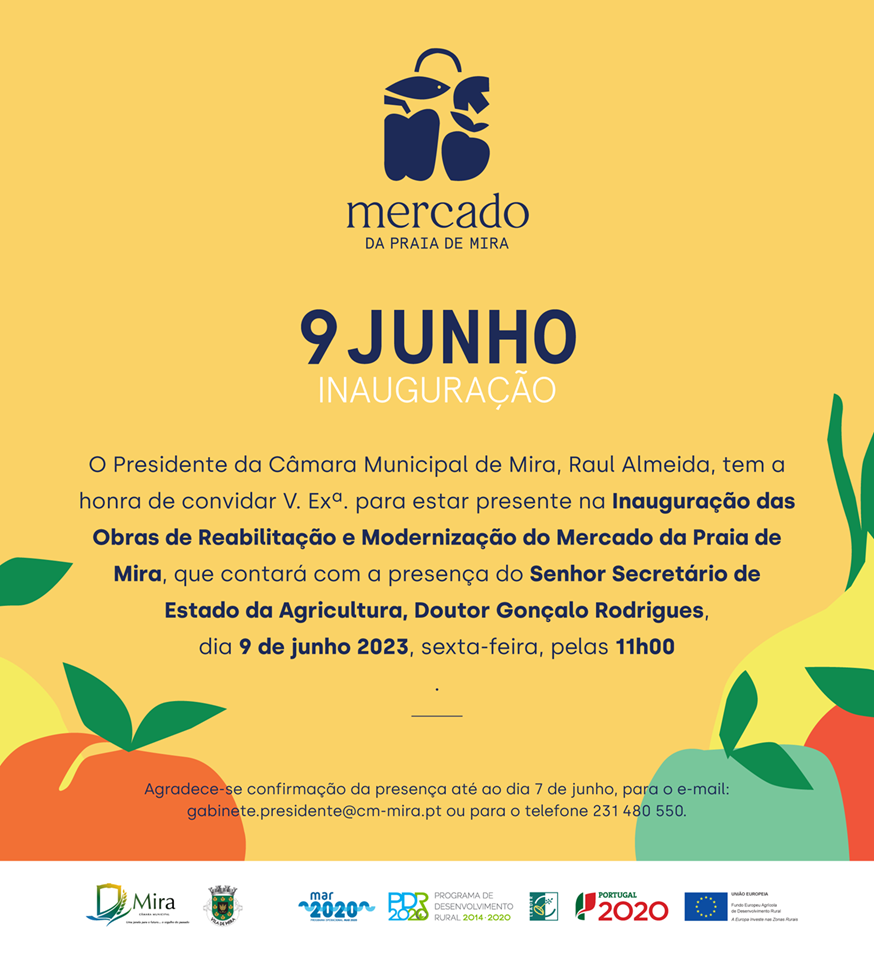 Assim, o Presidente da Câmara Municipal de Mira, Raul Almeida, tem a honra de convidar toda a população para estar presente na cerimónia de inauguração das obras de requalificação e modernização do Mercado da Praia de Mira, marcada para o próximo dia 9 de junho de 2023, pelas 11h00, que contará com a presença do Senhor Secretário de Estado da Agricultura, Doutor Gonçalo Rodrigues.