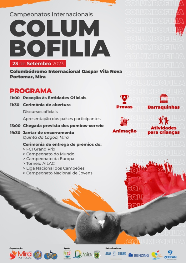 A Federação Portuguesa de Columbofilia (FPC) tem o orgulho de anunciar a realização dos Campeonatos Internacionais de Columbofilia - Mira 2023, marcados para o próximo dia 23 de setembro, com início às 11h00. O evento terá lugar no Columbódromo Internacional Gaspar Vila Nova, situado em Mira, Portugal.
