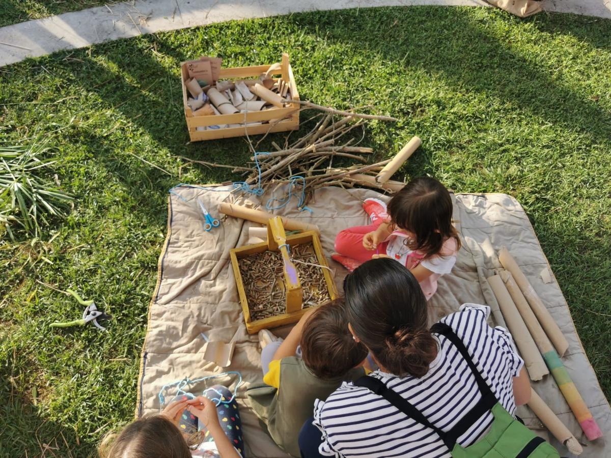Atividades de pinturas com tintas naturais; pulseiras, coroas e grinaldas, utilizando elementos da natureza; construção de hotel para insetos e comedouro para pássaros; construção de colares com missangas de sabugueiro e bastões da natureza, fizeram as delícias dos mais novos.