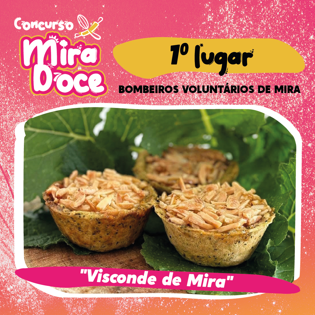 O doce vencedor foi inspirado no Visconde da Corujeira, figura que marcou a sociedade mirense do seu tempo e cuja memória ainda hoje perdura, de forma gratificante, na identidade coletiva de Mira. Com o objetivo de condignamente perpetuar a memória do ilustre benemérito em terras de Mira, os Bombeiros Voluntários de Mira atribuíram o nome de “VISCONDE DE MIRA” homenageando o ilustre e o concelho. A receita apresentada é uma seleção dos melhores produtos da gastronomia regional, como os grelos dos Carapelhos a abóbora do concelho em homenagem aos agricultores, e o vinho tinto inspirado na festa da telha da Presa. É uma excelente opção de sobremesa depois de um bom prato regional. A sua apresentação pública será feita durante as Festas em Honra de São Tomé, entre os dias 20 a 25 de julho de 2024.