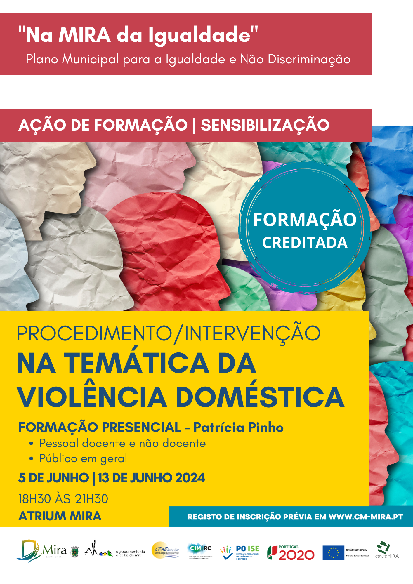 O Município de Mira, com a parceria do Agrupamento de Escolas de Mira e Centro de Formação da Associação de Escolas Beira Mar, promove uma Atividade de Formação de Curta Duração (6 Horas) dedicada aos procedimentos e intervenções na área da Violência Doméstica, como parte integrante do seu compromisso com o Plano Municipal para a Igualdade e Não Discriminação.