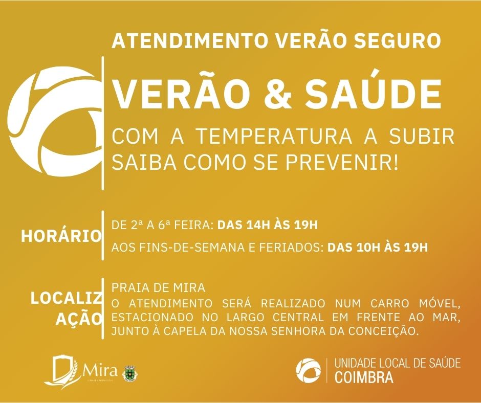A Câmara Municipal de Mira, em parceria com a Unidade Local de Saúde (ULS) de Coimbra, apresentam o novo Programa Atendimento Verão Seguro, com um posto de enfermagem móvel na Praia de Mira, localizado junto à Capela de Nossa Senhora da Conceição, em funcionamento a partir do dia 13 de julho até 31 de agosto.
