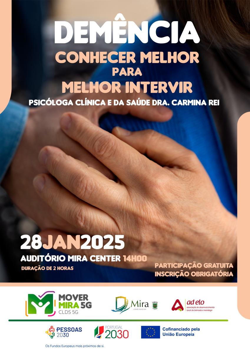 “Demência: conhecer melhor para melhor intervir” Esta ação terá lugar no próximo dia 28 de janeiro, às 14h00, no auditório do Mira Center. A iniciativa será conduzida pela Dra. Carmina Rei, Psicóloga Clínica e da Saúde, e tem como principais objetivos compreender o que significa viver com demência, através de relatos na primeira pessoa; entender as alterações de comportamento como formas de comunicação e debater estratégias que facilitem a comunicação com pessoas com demência.