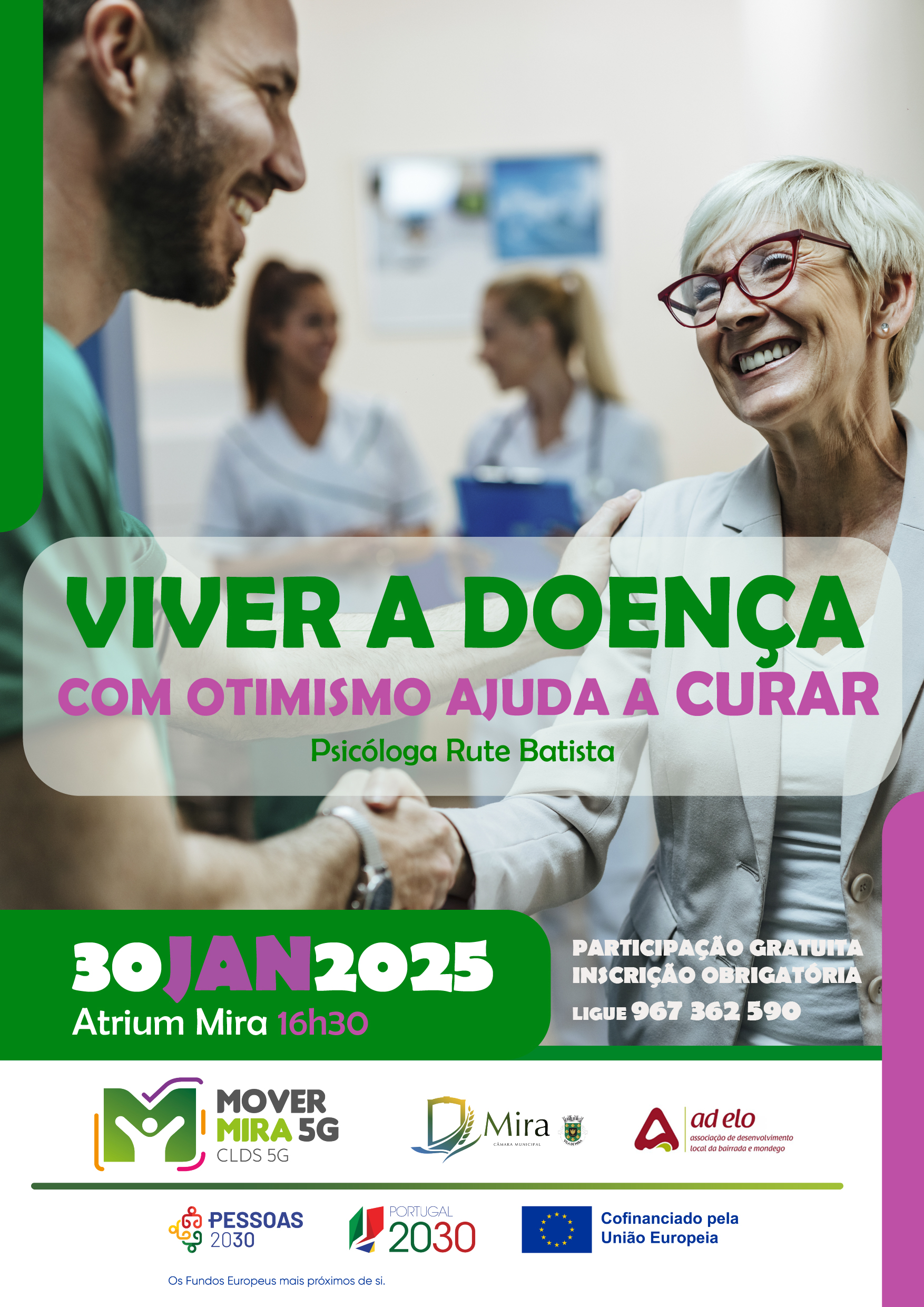 “Viver a doença com otimismo ajuda a curar” Com o objetivo de explorar o impacto de uma visão e atitudes positivas na imunidade e no tratamento de doenças, esta sessão decorrerá no Atrium de Mira, no dia 30 de janeiro, às 16h30. A formação será conduzida pela Psicóloga Rute Batista e incidirá sobre a influência das atitudes positivas na saúde física e mental.