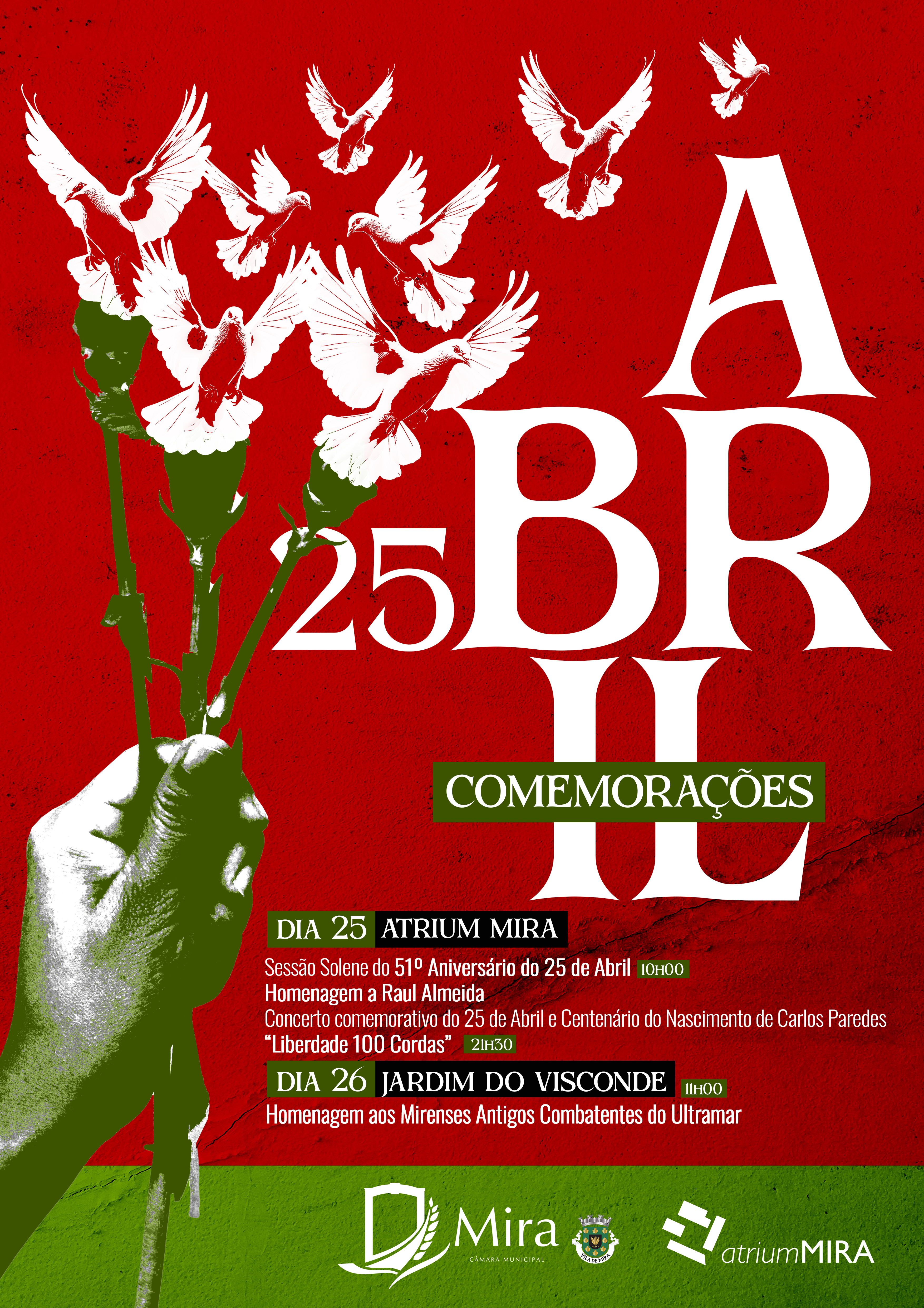 No dia 25, às 10h00, o Atrium Mira recebe a Sessão Solene comemorativa do 51.º aniversário da Revolução, onde será prestada homenagem a Raul Almeida, antigo presidente da Câmara Municipal de Mira e da Turismo Centro de Portugal, cujo legado marcou o desenvolvimento do concelho e da região.