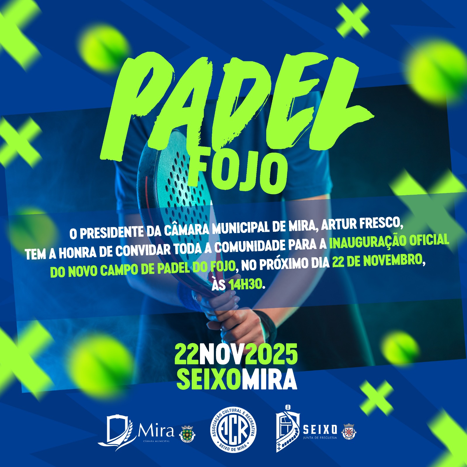 O Município de Mira inaugura, no próximo dia 22 de novembro de 2025, às 14h30, o novo Campo de Padel do Fojo, localizado no Seixo de Mira. Este novo equipamento desportivo representa um importante reforço na rede de infraestruturas do concelho, contribuindo para a promoção da prática desportiva e para o bem-estar da população.