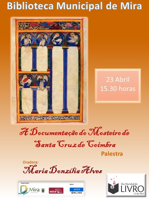 No próximo dia 23 de abril, pelas 15.30 horas, vai ter lugar na Biblioteca Municipal Mira, inserida na comemoração do Dia Mundial do Livro, a palestra “A DOCUMENTAÇÃO DO MOSTEIRO DE SANTA CRUZ DE COIMBRA”, a ser proferida por Maria Donzília Alves.