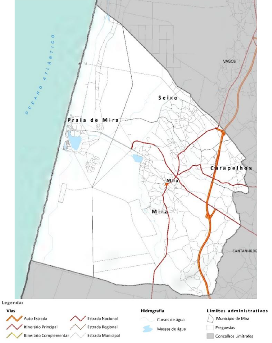 O Concelho de Mira possui uma área de, aproximadamente, 124km² integrando quatro freguesias que dividem administrativamente o concelho: Carapelhos, Mira, Praia de Mira e Seixo, tal como se pode observar na Figura n.º 1. O concelho pertence à sub-região Região de Coimbra (NUT III) -a qual corresponde de "grosso modo" ao Distrito de Coimbra, integrando ainda o concelho da Mealhada (distrito de Aveiro) e de Mortágua (distrito de Viseu) - e localiza-se na parte sul da Região Centro (NUT II), mais concretamente no distrito de Coimbra, entre as cidades de Aveiro (a norte), da Figueira da Foz (a sul) e de Coimbra (a nascente). Faz ainda parte integrante de uma vasta área que engloba a Ria de Aveiro.