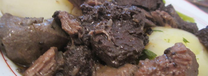 Em seguida coloca-se o alho a alourar, seguindo-se as febras, também elas cortadas em pedacinhos. Deixar novamente alourar esta mesma carne durante cerca de 20 minutos. Depois de bem tostada a carne, cortam-se as cebolas em rodelas grossas e deixa-se estufar em lume brando. Junta-se uma folha grande de louro, a pimenta, o sal, a salsa e cobre-se com vinho tinto até dois dedos acima do nível da carne. Deixa-se ferver 2 a 3 minutos e, em seguida junta-se o fígado também ele cortado aos pedacinhos.
