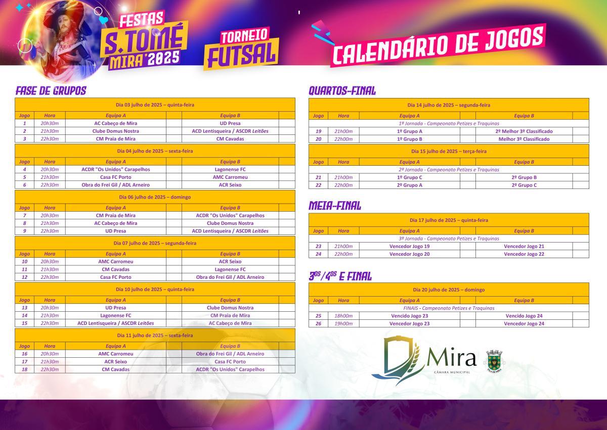 No âmbito das comemorações em honra do São Tomé, Padroeiro de Mira, realizar-se-á, mais uma vez, o Torneio de Futsal.
